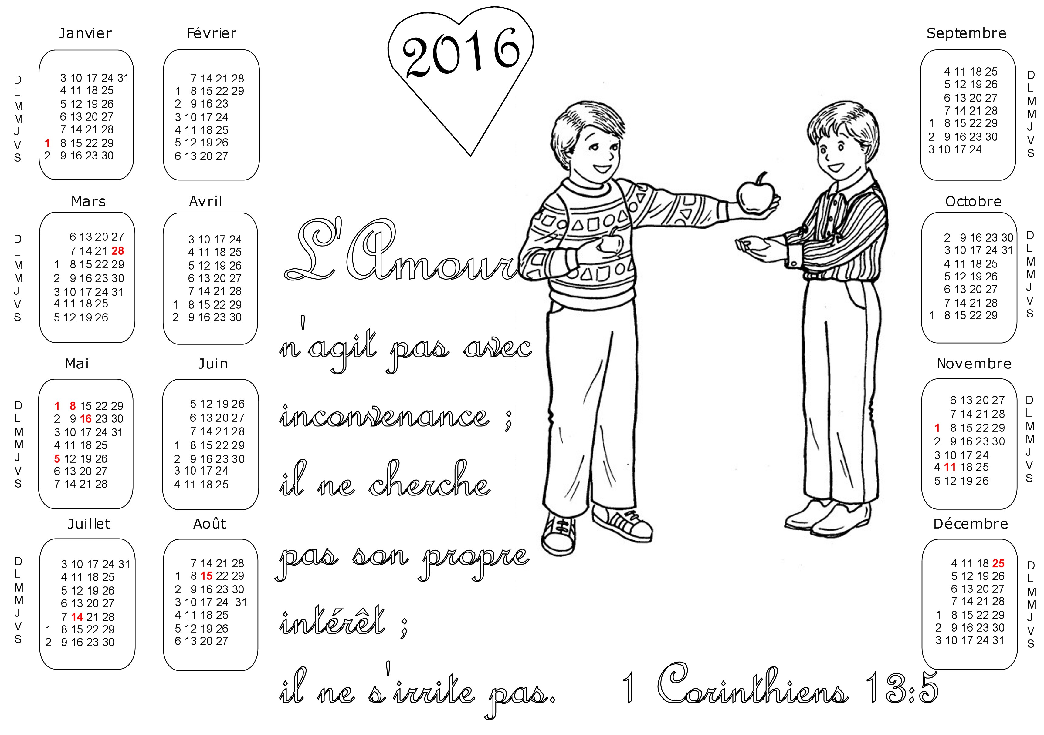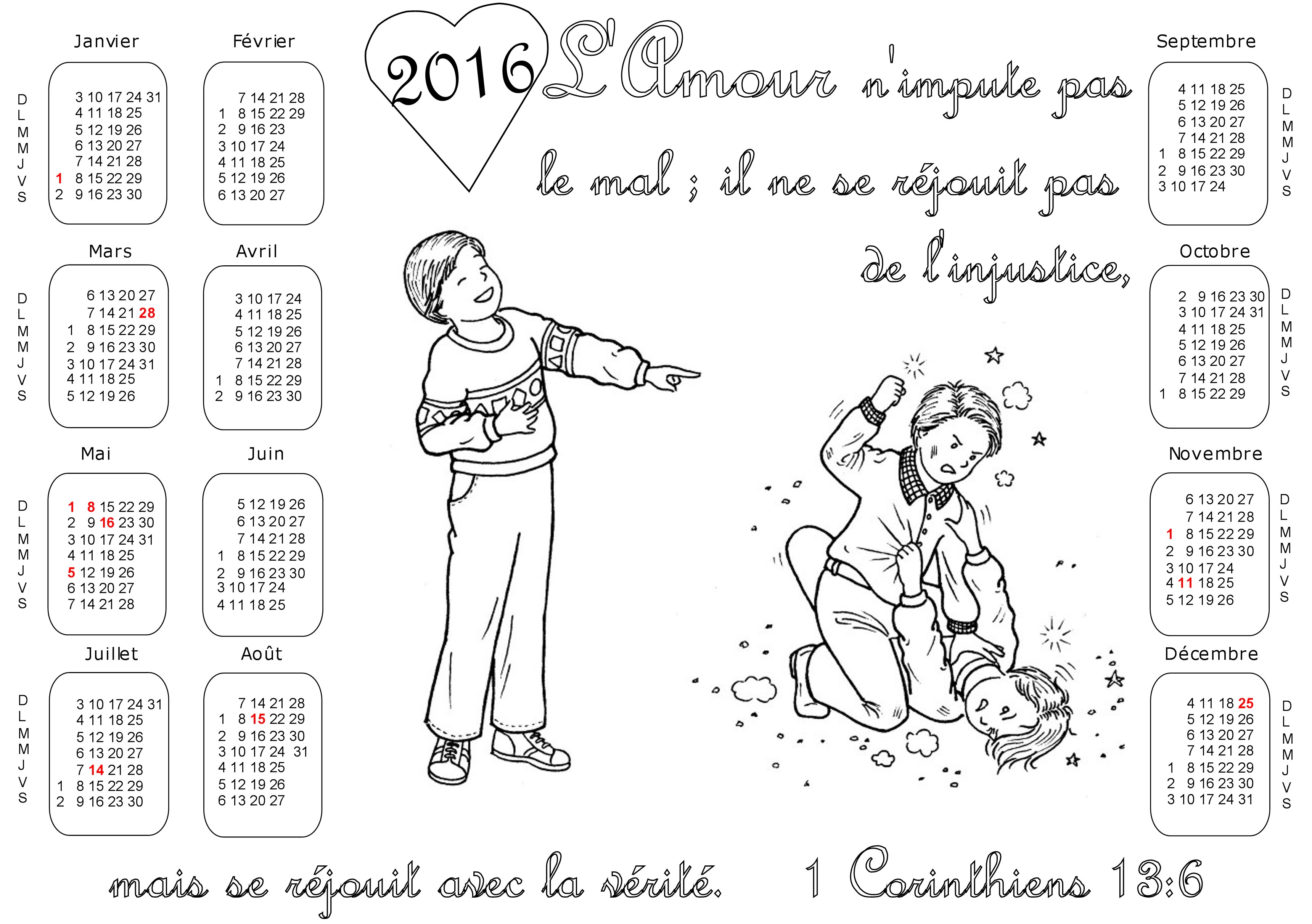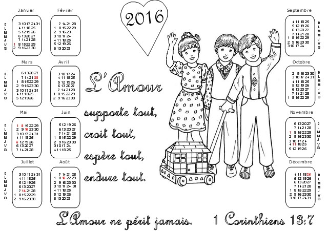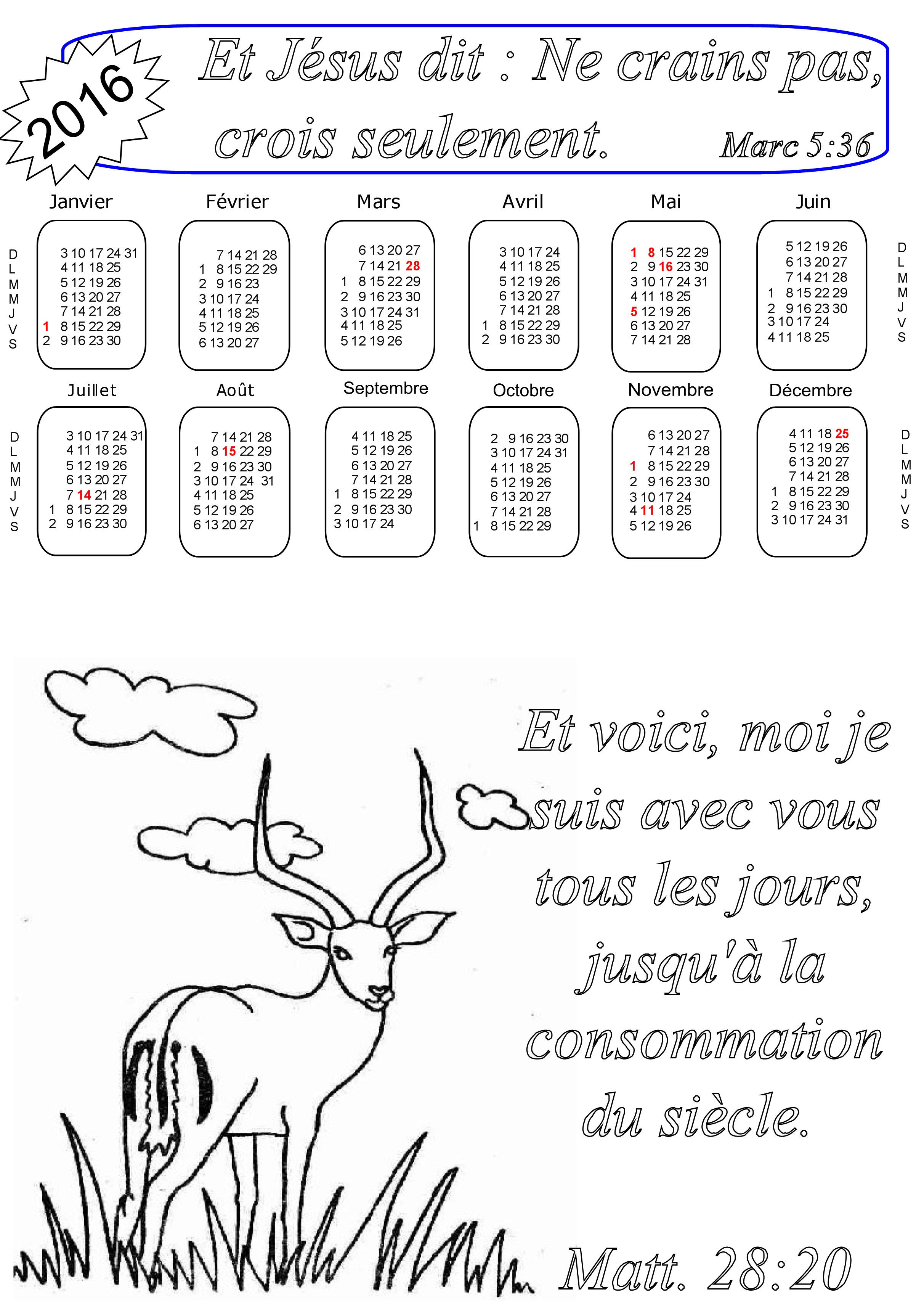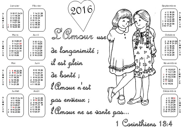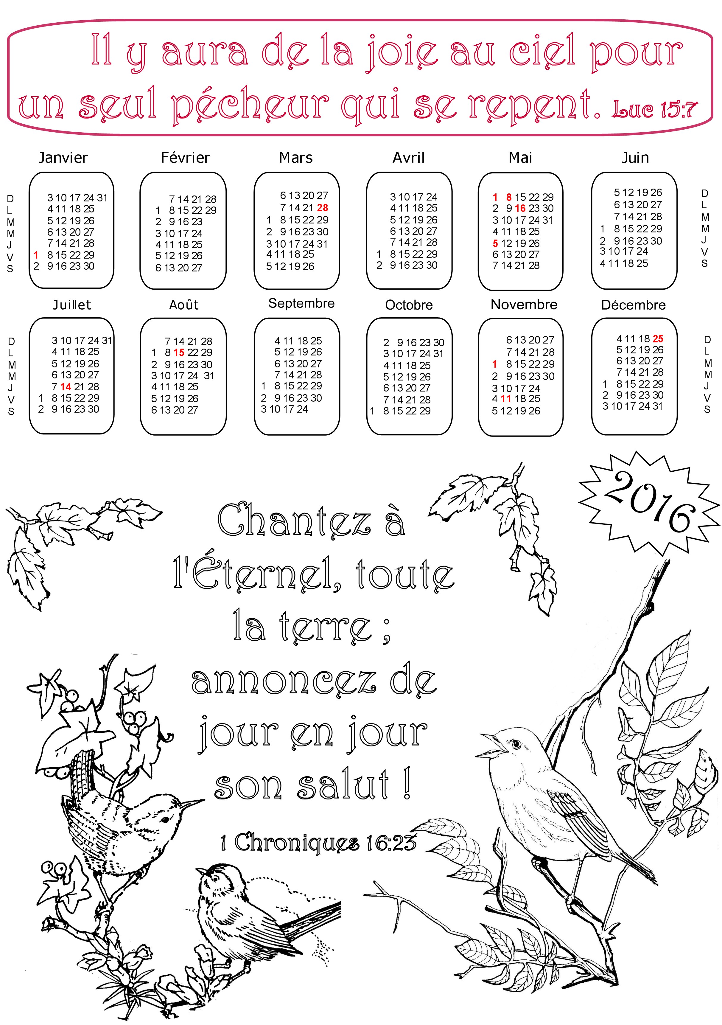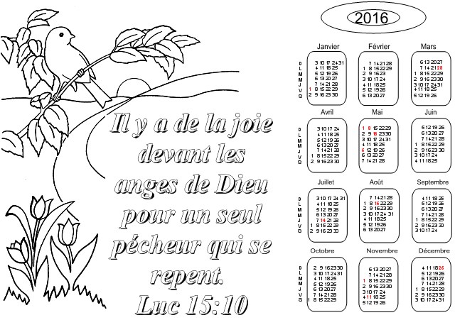 - 1 ère série : 31 calendriers pour l'année 2016 à colorier, avec des versets de la bible :