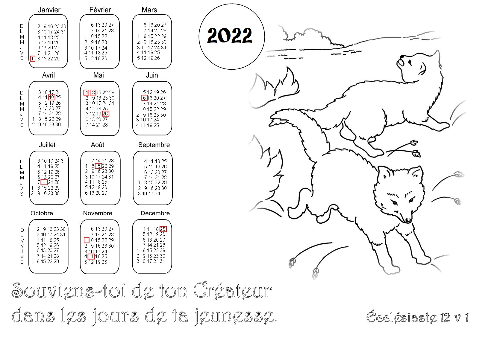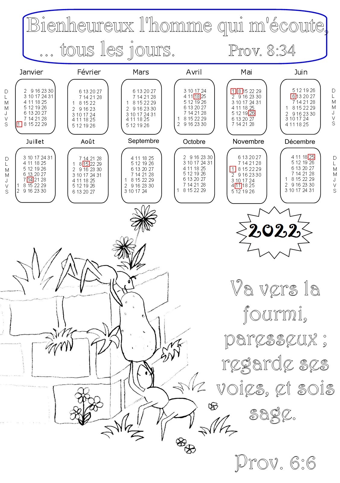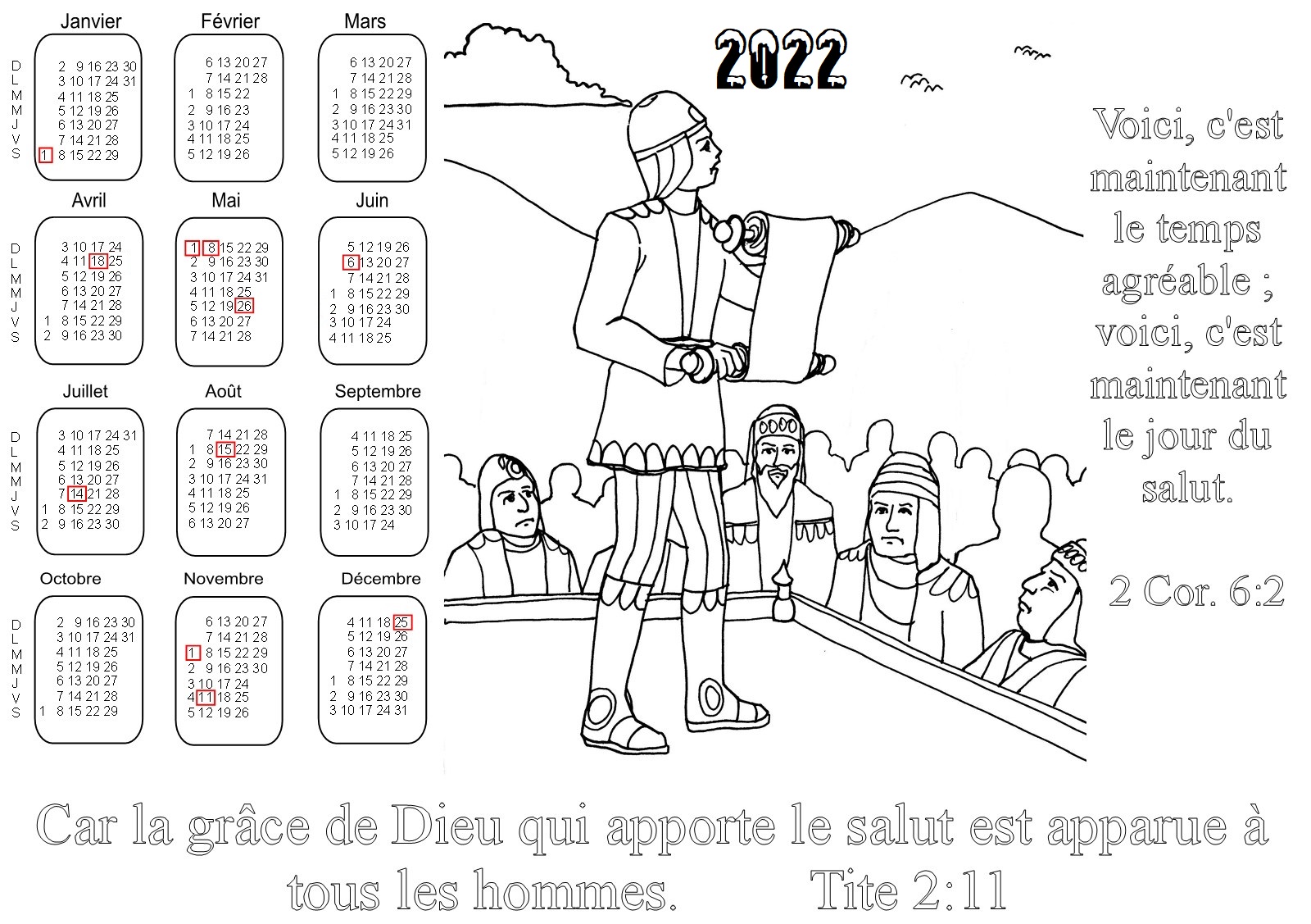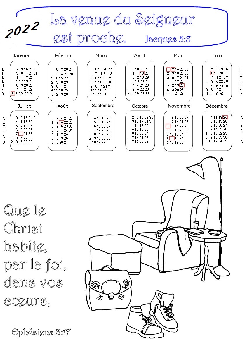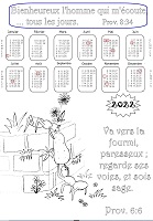 - 1ère série : 19 calendriers pour l'année 2022 à colorier, avec des versets de la Bible :
