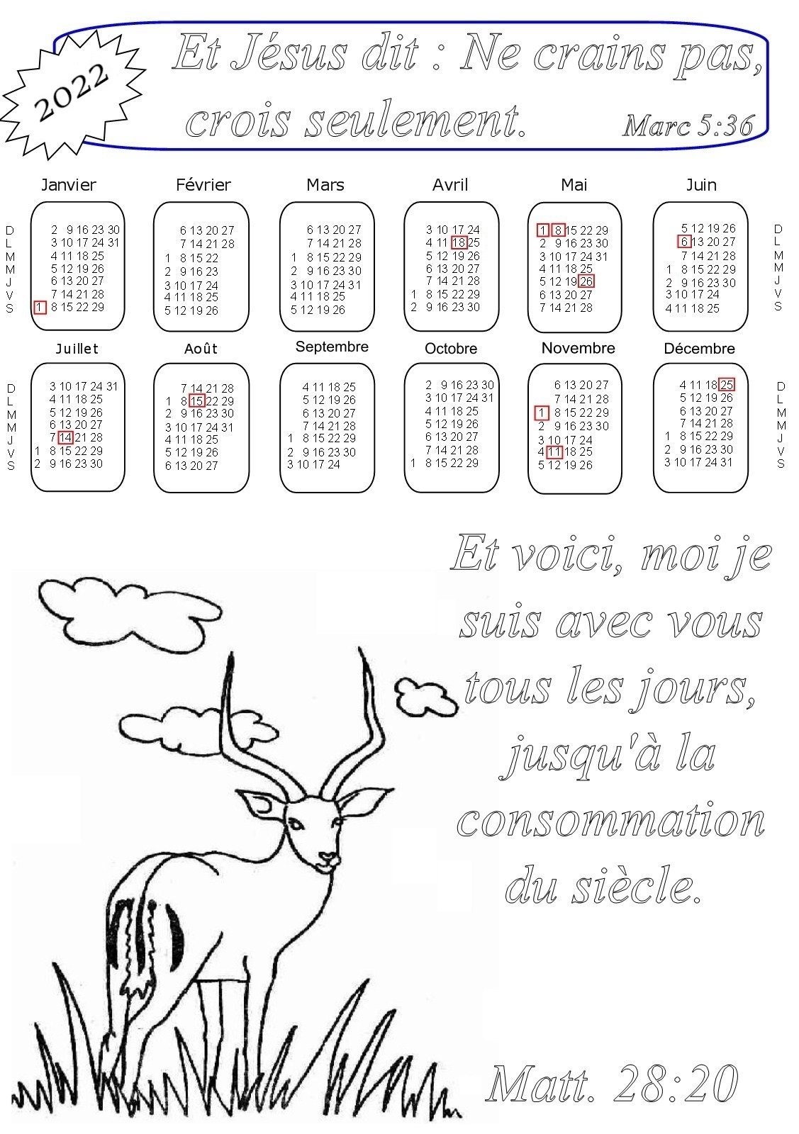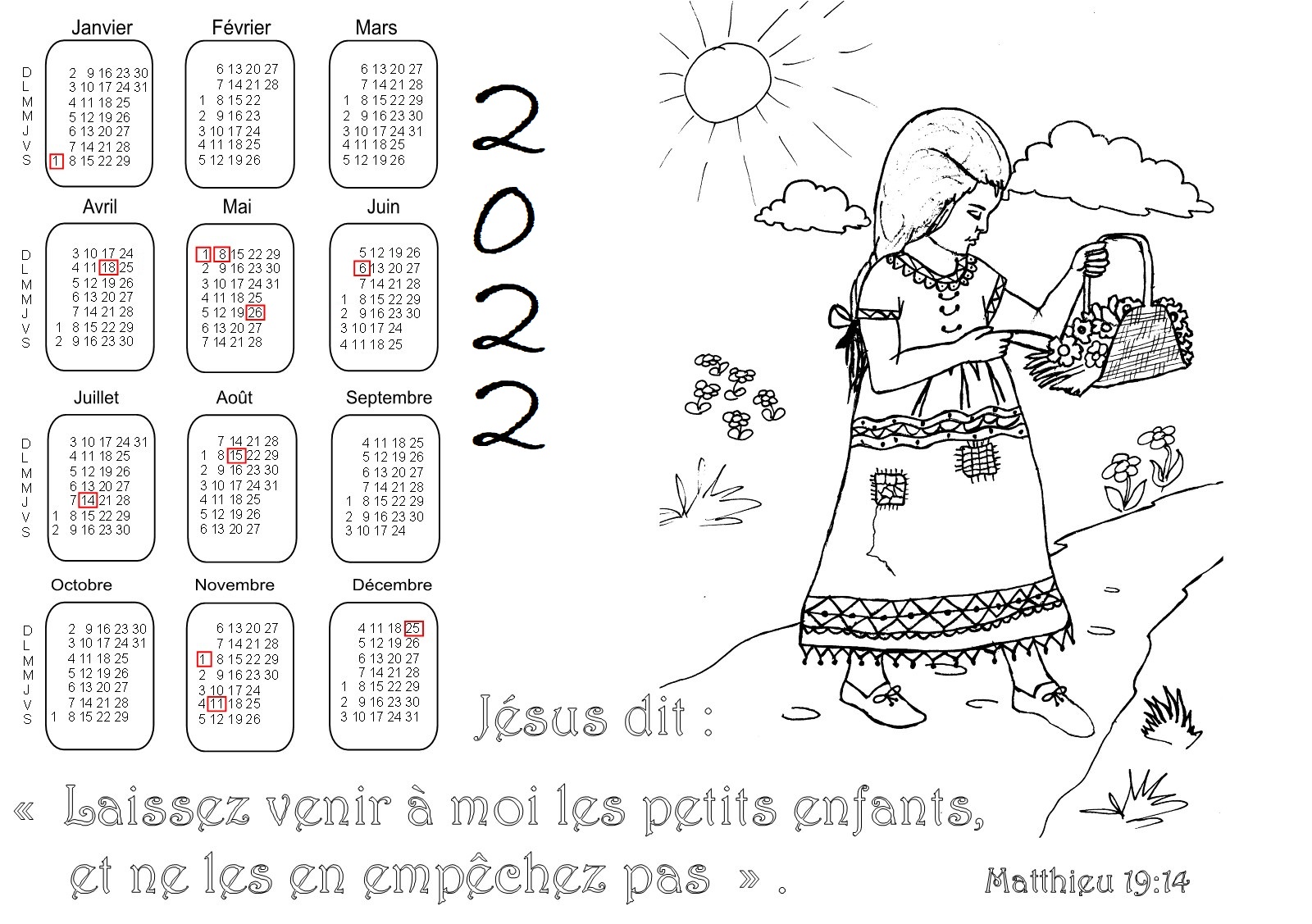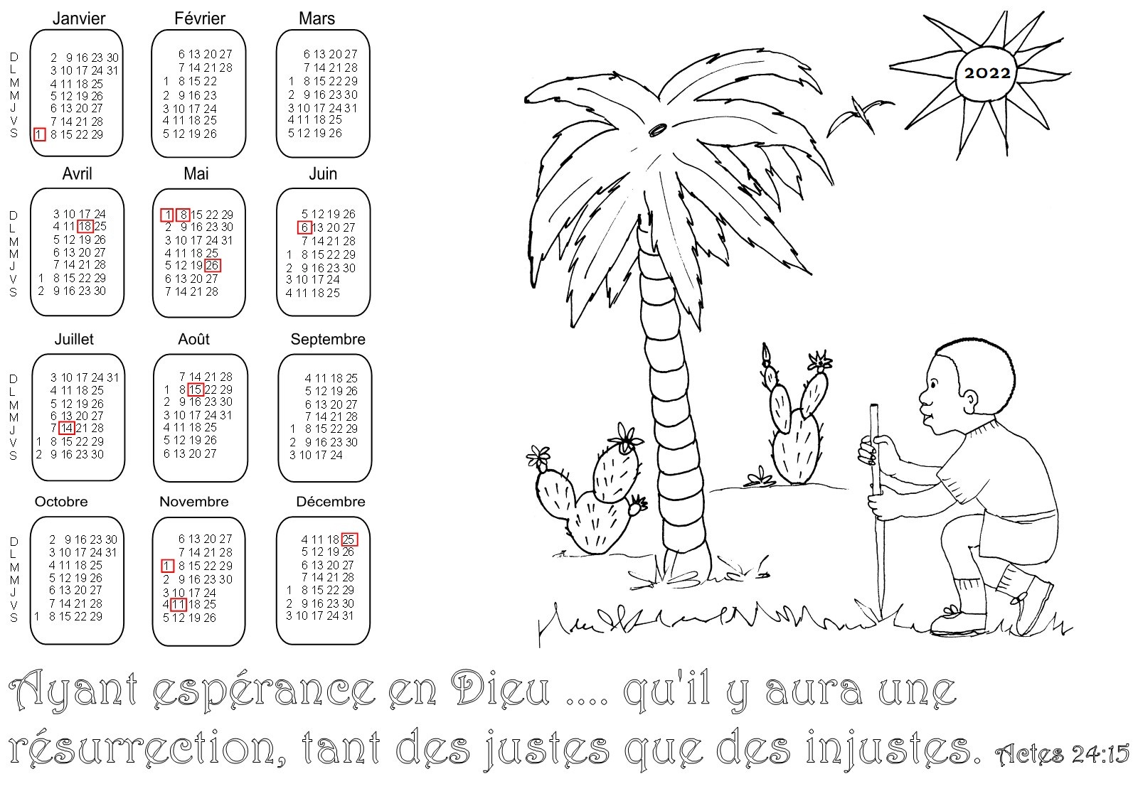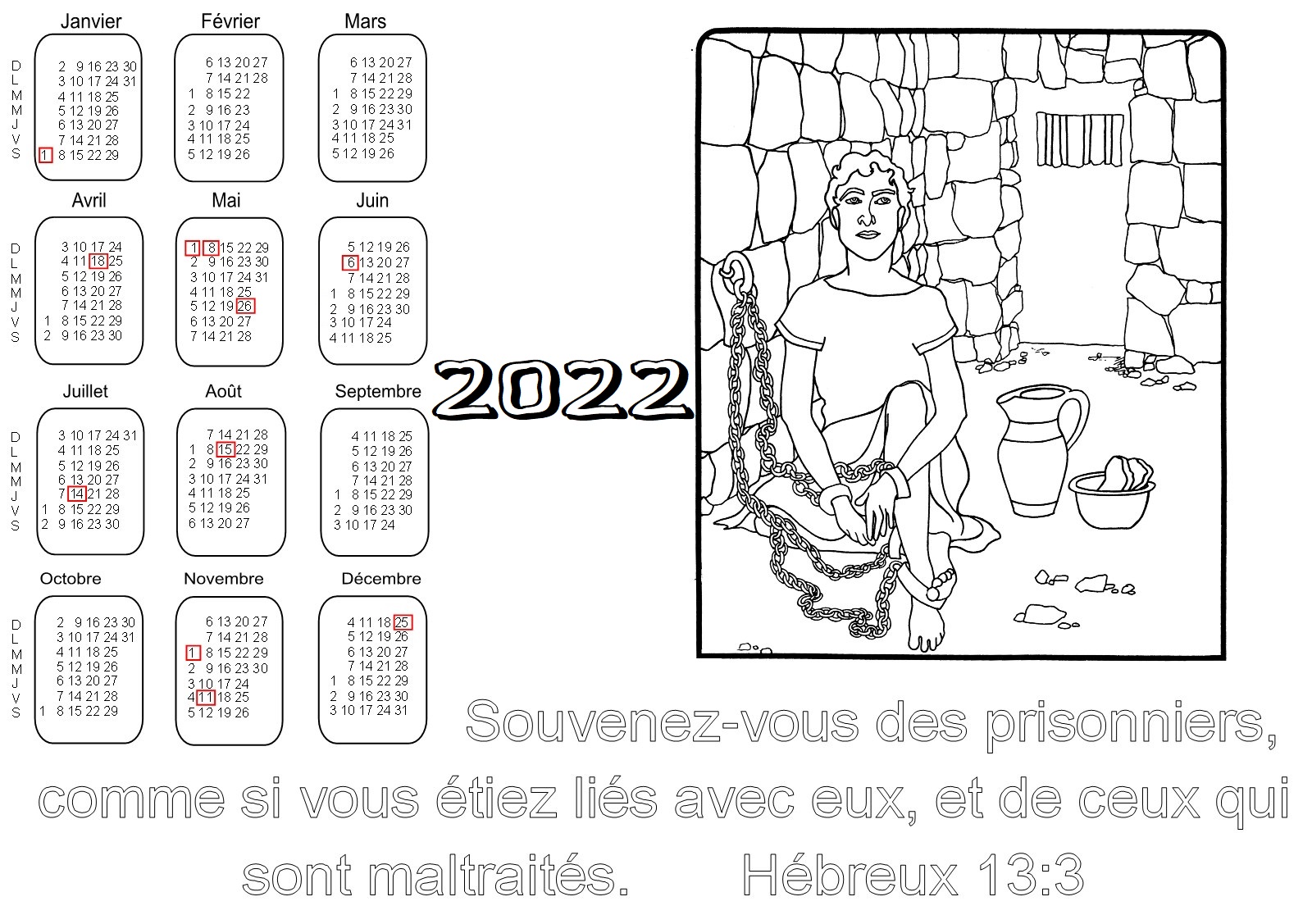 - 1ère série : 19 calendriers pour l'année 2022 à colorier, avec des versets de la Bible :